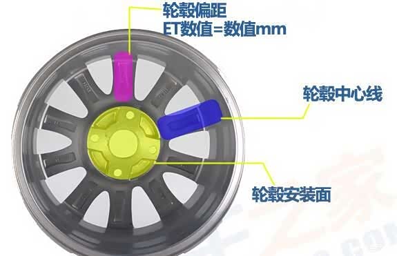 轮毂和轮胎一样都有信息点,不过轮毂的信息点一般都显示在内侧,而且要仔细观察,知道上面那些信息点你就了解自己的轮胎该怎么选,主要是由轮毂宽度(决定轮胎宽度)、轮毂偏距(偏距越小,安装后轮毂就会偏出车外越多;偏距过大会出现摩擦车辆悬挂系统)、中心孔大小(决定车轮能否装的稳)、孔距(决定轮毂能否装的下)四个参数决定。