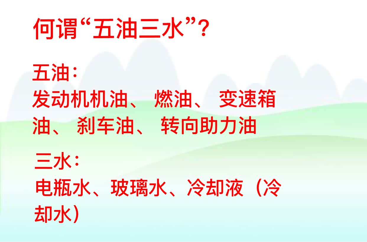 五油:发动机机油、燃油、变速箱油、刹车油、转向助力油
