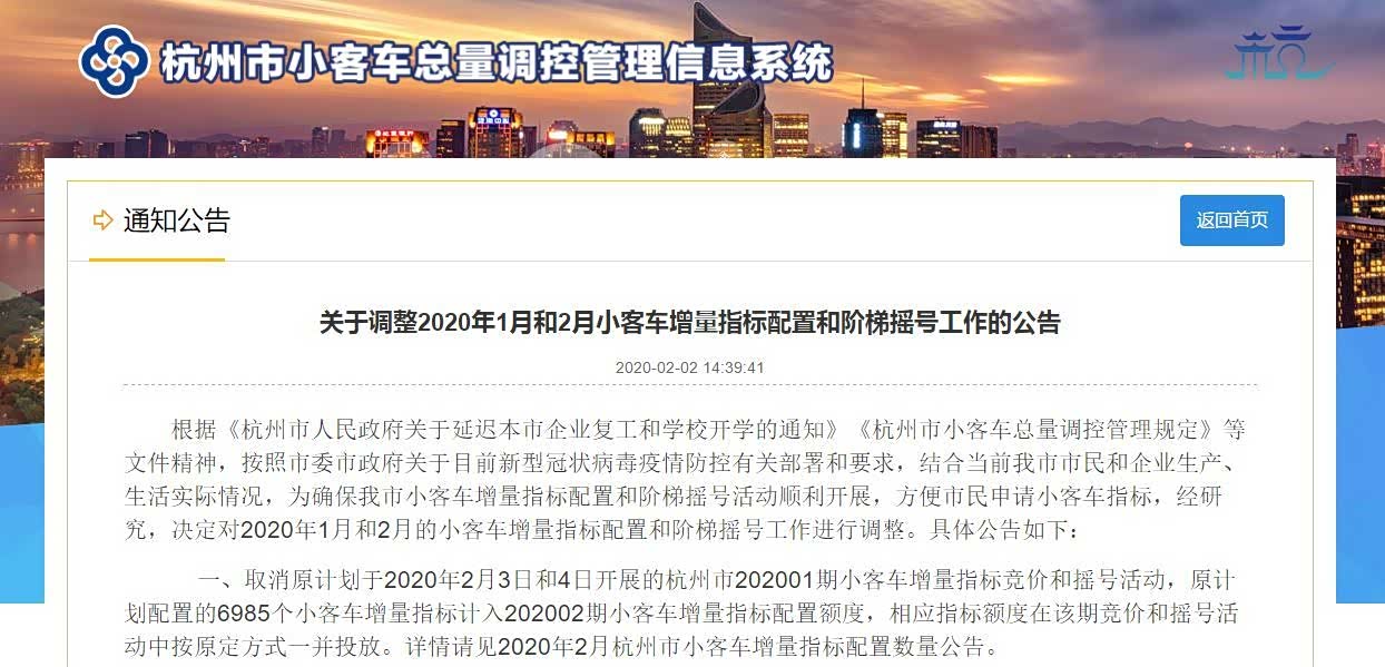 2月2日,杭州市小客车总量调控管理信息系统发布公告称,杭州市决定取消原计划于2020年2月3日和2月4日开展的杭州市202001期小客车增量指标竞价和摇号活动,同时,原定于2月7日举行的2020J1期个人阶梯摇号活动也将延期至3月2日举行。