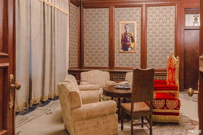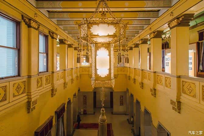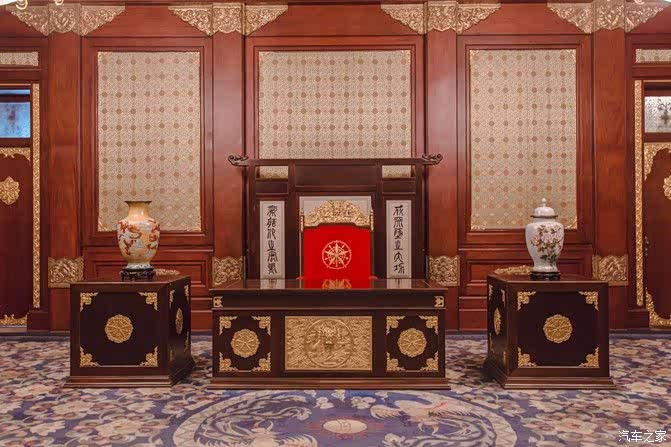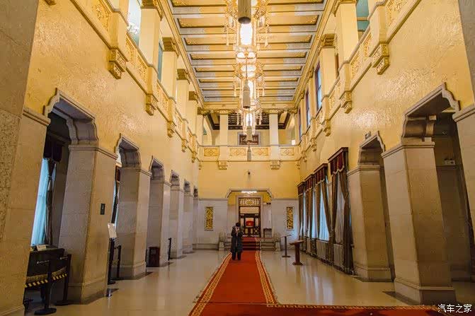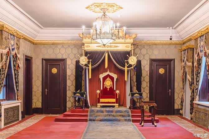 主建筑是同德殿,相当于乾清宫吧。溥仪起居和接见都是在这里,大殿里面不大,还有二层的回廊。吊顶还用了宫灯的样式,大殿尽头就是觐见大厅。这里是溥仪正式接见外宾的地方。相当于铁王座吧,内饰都是很风的。当然龙椅换成了伪满皇室的兰花徽章。