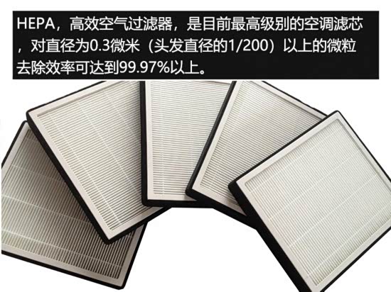 HEPA(HighefficiencyparticulateairFilter),中文意思为高效空气过滤器,是目前最高级别的空调滤芯,能达到HEPA标准的过滤网,对于0.1微米和0.3微米的有效率达到99.7%,HEPA网的特点是空气可以通过,但细小的微粒却无法通过。它对直径为0.3微米(头发直径的1/200)以上的微粒去除效率可达到99.97%以上,是烟雾、灰尘以及细菌等污染物最有效的过滤媒介。