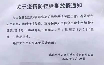 2月20日,一家位于北京顺义区的机动车检测场宣布复工时间,暂定在2020年3月2日复工。同时,各区域4S店的销售人员表示已接到所在区域车管所和检测场的通知。