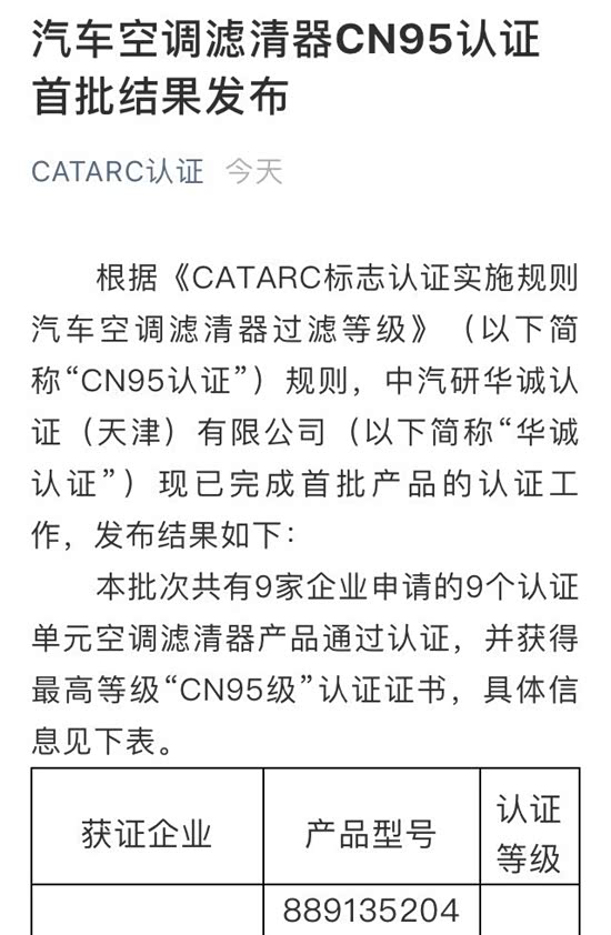 2月12日,中汽研华诚认证(天津)有限公司(以下简称“华诚认证”)推出了国内首个CN95认证(即汽车空调滤清器过滤效率分级认证,以下简称“CN95认证”。其中C为汽车英文Car的缩写,N95为空调滤清器过滤效率级别)。华诚认证同时宣布,在疫情期间为企业免费提供此项认证服务。