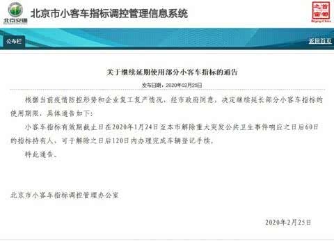通告称,小客车指标有效期截止日在2020年1月24日至北京市解除重大突发公共卫生事件响应之日后60日的指标持有人,可于解除之日后120日内办理完成车辆登记手续。