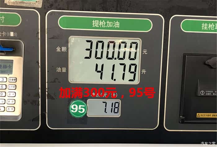 为了保证这次油耗记录的真实性。我在油表灯一亮的时候记录下来后面公里里程为4611,然后去中石化旗下的网点加了95号汽油。300元钱,单价7.18/升,共计41.80升。