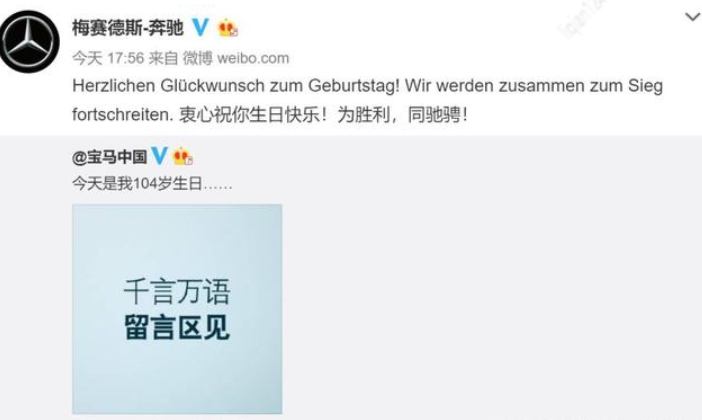相爱相杀的竞争对手:奔驰和宝马,再次抛弃了奥迪。3月7日,宝马中国官方微博发布消息:“今天是我104岁生日……”评论区有500多名网友发表评论。随后,奔驰官方微博转发称,“衷心祝您生日快乐!为了胜利,一起驰骋吧!”