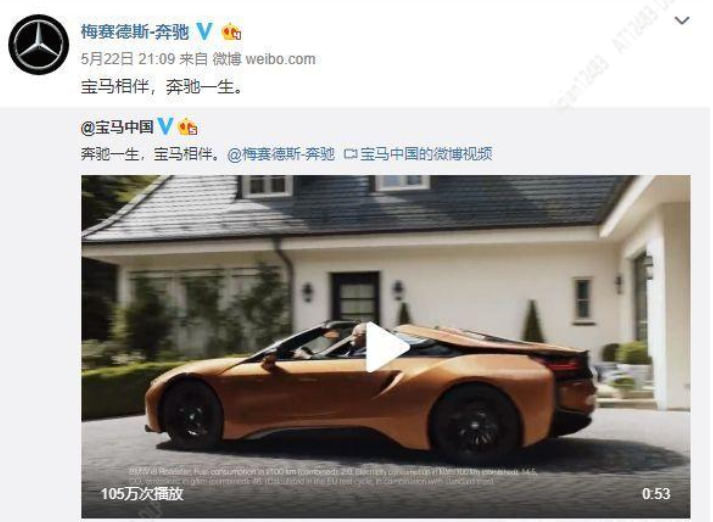 淘气的宝马并没有遭到梅赛德斯-奔驰的报复,反而两家车企都表示了感谢。宝马中国官方微博发布了这段视频,称:“奔驰与宝马同住”。奔驰官方微博甚至转发称“宝马陪伴奔驰一辈子”