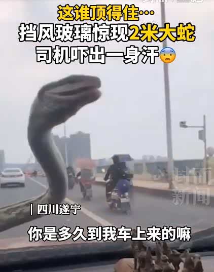 视频中一条大蛇在挡风玻璃上探头爬行,看起来要“贴到脸上”。“边流汗,边开车...”