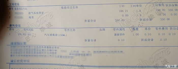 这是结算单,350元是进气系统养护,0.1元是汽车消毒,整体体验挺好,就是觉得用牙刷刷节气门有点不是太好吧,算了研究那么多也都做完了,下次我自己清洗吧,这一次也算学会如何清洗节气门了!
