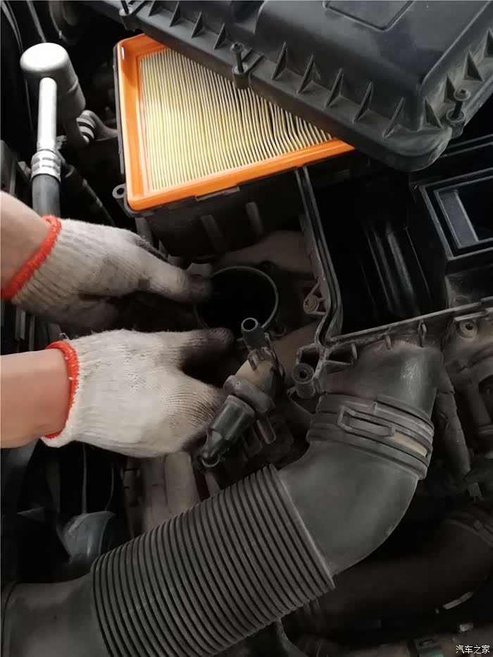 在给进气管接口涂抹润滑油,说是都是塑料接口,上油好安装上。