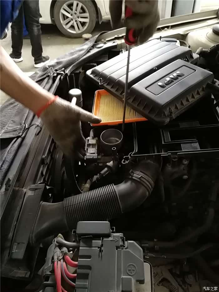 正在拆卸空滤保护盖的螺丝。