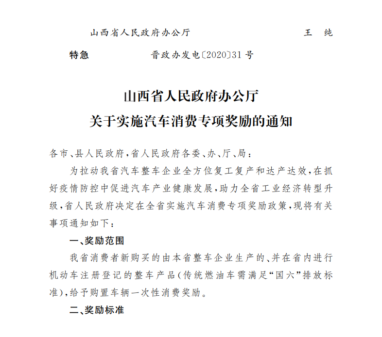 近日,山西省政府办公厅发布了《关于实施汽车消费专项奖励的通知》,决定在全省实施汽车消费专项奖励政策。