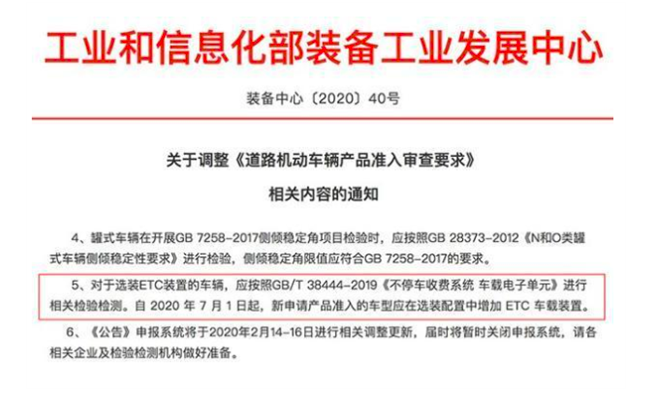 第二条是根据工信部规定,7月1日起新申请产品准入车型应在选装配置中增加ETC车载装置,这意味着未来的新车将会提供原装车载ETC这个配置供车主选装。