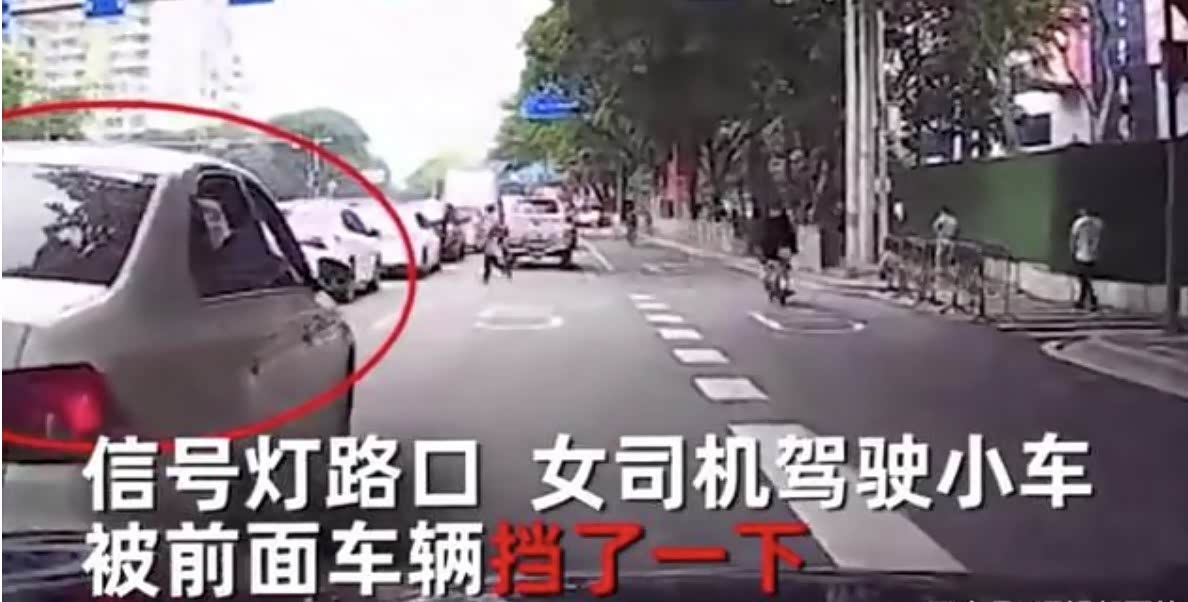 从视频画面中可以看到,事件发生在一个红绿信号灯路口,女司机驾驶的小轿车被前面的车辆挡了一下,再加上起步比较慢,便被后方的车子超越。本来是件很平常的事情,但是之后女司机的做法却把超车司机给吓了一跳。
