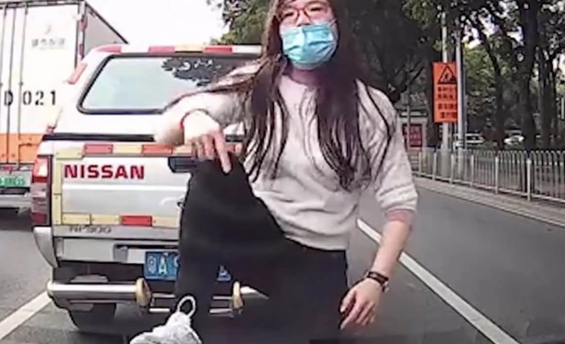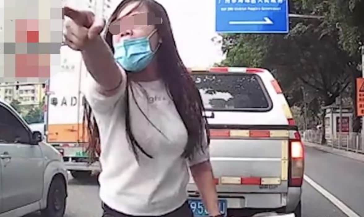 只见超车司机正停车在等候红灯的时候,一名身穿白色上衣,戴着口罩的女子突然出现在车前面,一边用力拍打着车子的引擎盖,一边指着超车司机破口大骂,几次想跟超车司机动手,之后甚至还把自己的脚踩在车引擎盖上,双手叉腰对着司机大吵大闹。