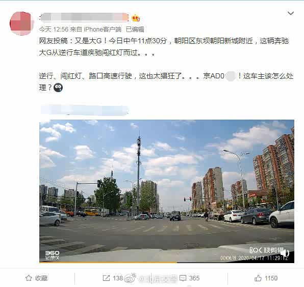 网友称:今天中午11点30分,在朝阳区东坝朝阳新城附近,一辆奔驰大G从逆行车道疾驰闯红灯而过。网友称:“闯红灯、路口高速行驶,这也太猖狂了,并提供了车牌号……”