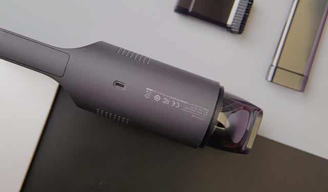 背面是一些其它的信息以及一个Type-C的充电接口,吸尘器两侧是出风口,出风口采用对称式设计,让吸尘器颜值提升了不少,手柄和机身长度尺寸的比列也比较协调,整个外观设计非常漂亮。充电式也比较方便携带。