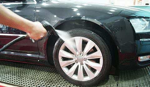 第六步:待全车身擦拭完后,用清水冲净车身上的洗车液。在冲洗时务必按照自上到下的顺序进行,以免事倍功半。