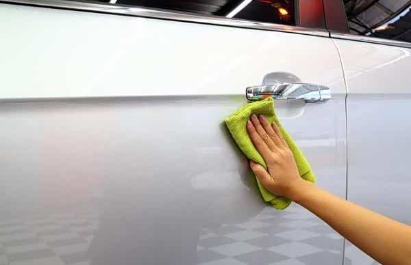仔细清除车身上还残留的一些污渍,这需要使用除垢水来配合使用。在清除污渍时要沿着与汽车行驶相垂直的方向来擦拭。