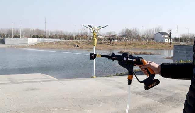 下面是重点,也就是洗车机的出水流量和压力,洗得干净不干净,不在于洗车机设计的人性化不人性化,而是他出水的力度和出水量,这张照片是喷头0度高压喷射效果,看上去出水量不是很大,但是压力却很高,因为有风,而且是逆向风,天气又比价晴朗,水流看上去并不大,实际上能喷7-8米没有问题,如果角度合适,我觉得喷10米也有可能,另外端在手里也不算是很压手,后面电池,前面喷头,力量还比较均衡,握感也比较舒服,成年人端半个小时没问题,另外电机的噪音不大,拿在手里几乎没有震动感,不像那些大家伙,震得手腕疼,这个几乎没啥感觉。