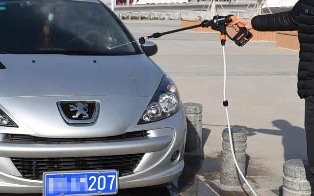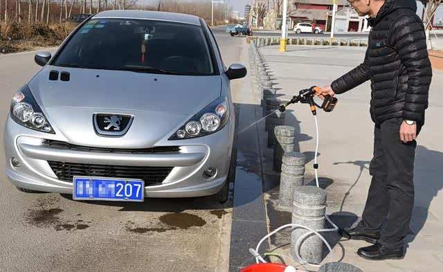 实际拿这款洗车机来洗车,才发现,我这款标致207在这款洗车机面前显得是那么的低调,可能是第一次享受这种高级待遇,就连我也觉得有些不配套,笑话归笑话,但的确,从河里用水桶提上一桶水,然后打开洗车机,来来往往这回头率也是醉了,轮胎上刹车片留下的黑色痕迹,轻而易举就能冲洗掉,而且左手被释放出来,竟然不知道干点啥好,另外,需要重点说一下的是,这款洗车机非常的省水,16L的水桶,如果是普通的清洗,完全够用了,本来是配备的有泡沫桶的,但因为标配里面没有,所以无法演示喷洒泡沫的功能。