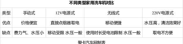 面对多种类型的家用洗车机,您是不是挑花了眼呢?其实没有绝对的选择哪款和不选择哪款,要结合自身的实际情况来定。不过手动式和12V电源式的我不太推荐,因为手动式洗车机洗完一辆车实在是太累了,而12V电源式洗车机,确实在取电和水压方面有着一定的不足。