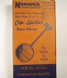 第一款广泛分布的汽车后视镜被一位名叫埃尔默·伯杰的人士作为“Cop-spotter”出售。 作为汽车配件,“Cop-spotter”零售价约4美元。 (直到20世纪20年代后期,汽车才开始经常使用各种镜子。)