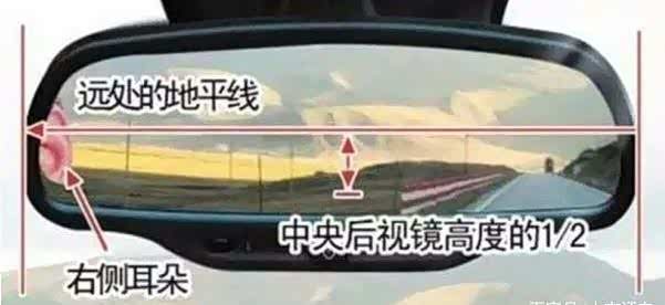 3、车内后视镜的调整方法。车内后视镜左右的要调节到使视线正好从驾驶员右耳外侧通过,看不到驾驶员的右耳;车内后视镜的上下要调节至地平线正好处于镜子中间的位置为好。