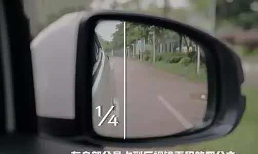 2、右后视镜的调整方法。一般情况下,右后视镜的上下要调节至天空占镜面上半部分约1/4的位置;右后视镜的左右要调节至车身的面积占后视镜面积约1/4,能看到后面拉手。