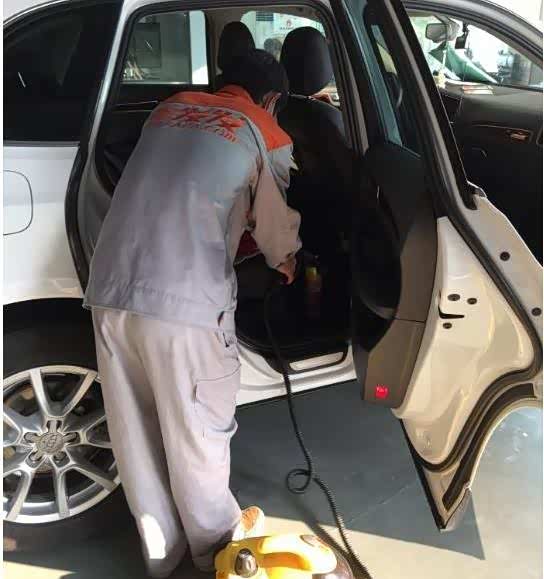 在开始施工前要取走车内所有物品包括后备箱里的东西,座垫拆除后放进大储物箱中,物品摆放有序,要记住物品的原位置,以便放回,不要丢失东西。同时施工人员会根据车内情况进行一个工作时间的预估,通常整套流程下来需要两三个小时,如果车内较脏的情况下清洗时间会更长。