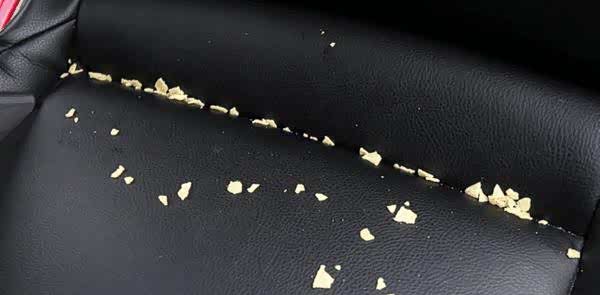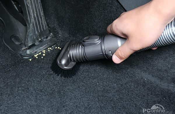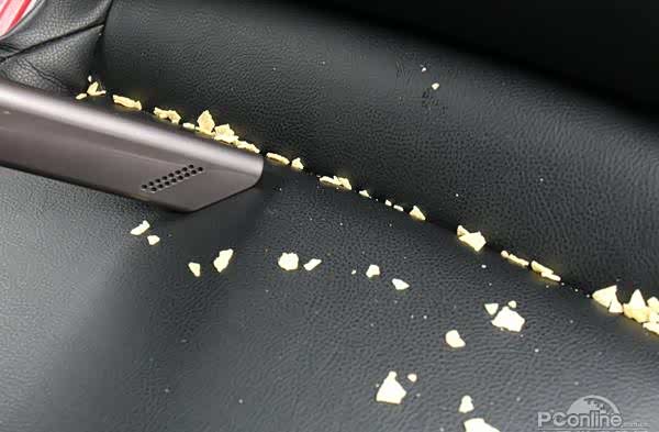 我们在汽车座椅缝隙位置上找到小孩吃剩下的薯片碎,这些饼干碎会残留在座椅的边缘角落环境。我们通过缝隙清洁刷头,可以看到它的吸附能力相当强,手持清洁这些死角相当轻松。