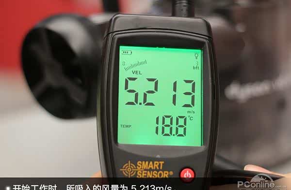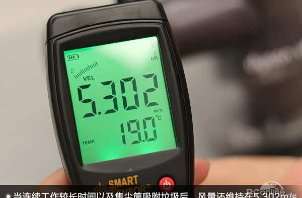 我们将会通过风力测试仪,看长时间工作5分钟左右时间后,集尘筒里面装满垃圾后,它的吸入风量是否有减弱的现象。