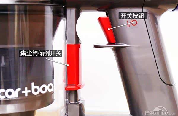 戴森设计师们为减少用户与灰尘以及过敏原接触的机会,使用集尘筒旁边的红色按钮,往下按可以打开集尘盒的底盖,把垃圾直接倒到垃圾桶里,用户不需要另外接触。