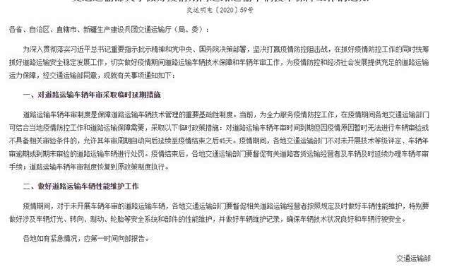 对于卡车车主来说也是一个好消息,交通运输部在2月12日印发《关于做好疫情期间道路运输车辆技术保障工作的通知》。《通知》指出,对道路运输车辆年审时间到期但因疫情原因暂时无法进行车辆审验或不具备相关审验条件的,允许其年审周期自动向后延续至疫情结束之后45天。疫情期间,各地交通运输部门不对未开展技术等级评定、车辆年审逾期或到期未审验的道路运输车辆进行处罚。疫情结束后,各地交通运输部门要督促有关道路客货运输经营者及车辆及时延续办理车辆年审手续;道路运输车辆年审制度恢复到原政策制度执行。