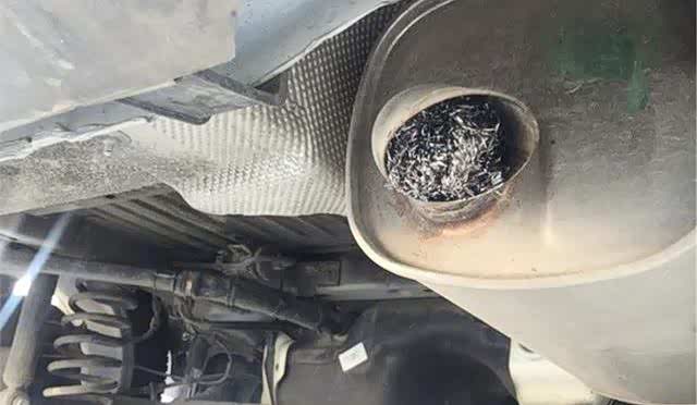 第二条,也是让许多车主比较“信服”的绝招,塞钢丝球把排气管给堵住,认为这样能有效减少汽车的尾气排放。