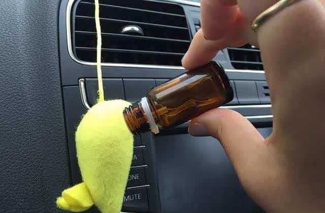 拒绝购买空气清新剂特殊的商店。找一些精油,滴在汽车内任何地方。