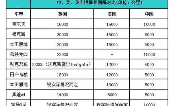 通过搜索,我分别找到了美国、英国主流车型车主手册上的车辆保养里程间隔,并将它们同中国做了一个简单的对比