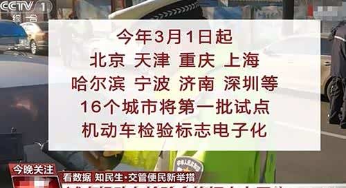 而对于取消机动车纸质版检验标志,而改为电子化的检验标志,在3月1日实施中,并不是全国所有地区同步实施的,只限个别地区试点推行。比如自2020年3月1日起,优先在北京、天津、上海、重庆、哈尔滨、南京、杭州、宁波、济南、株洲、深圳、海口、成都、贵阳、玉溪、乌鲁木齐等16个城市进行试点。尽管3月1日起,只在部分地区优先实行,但相信在不久后,也会在全国范围内施行,这样 一来,车主们完全不用担心黏贴检验标志而遮挡行车视线,以及因没黏贴检验标志而出现的交通违章行为。