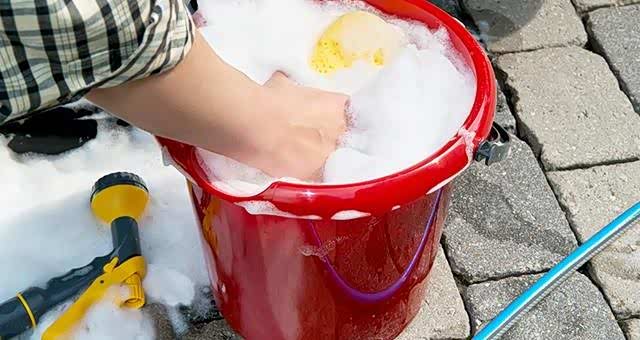 冲洗完后,将洗车剂倒入水桶中冒泡。如果您想让气泡更加丰富,可以将高压水嘴插入水桶。如果泡沫完成,将洗车布放入桶中并一次擦一块面板。建议从顶部到底部擦拭并从阴影处擦拭。