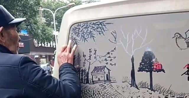 这辆面包车已经使用了五年了,车主在经济能力提高之后,就买了新车,而这辆面包车就被停在路边,被车主不闻不问了。有一位老爷爷就在布满灰尘的后车窗上做了一幅画,画的还不错呢!在这幅画中,老爷爷画了一株顶天立地的大树,中间花了两个小学生有说有笑的样子,小学生的脖子上,还系着红领巾。在小学生的脚下,还画了两只小鸡,在天空中,还飞着几只小鸟,画面栩栩如生。网友不得不感慨,这位老爷爷,还是位高手!民间果然卧虎藏龙啊。