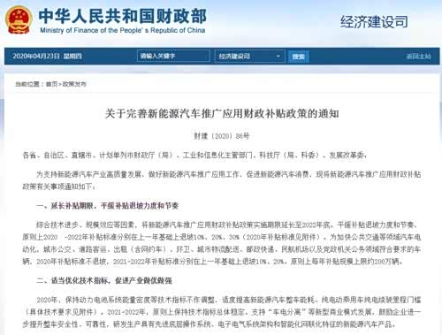 据财政部网站4月23日消息,近日,财政部、工业和信息化部、科技部和发展改革委联合发布了《关于完善新能源汽车推广应用财政补贴政策的通知》。