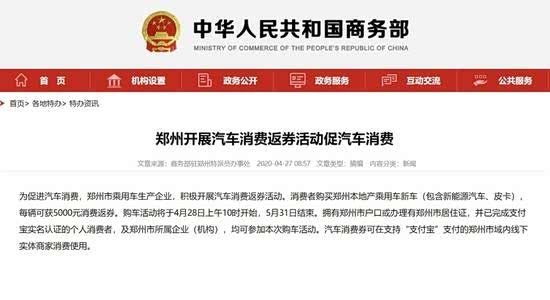 此外,据记者了解,郑州市上述购车活动将于本月28日上午10时开始,5月31日结束。凭借郑州市户口或办理有郑州市居住证,并已完成支付宝实名认证的个人消费者,及郑州市所属企业(机构),均可参加本次购车活动。据悉,汽车消费券可在支持“支付宝”支付的郑州市域内线下实体商家消费使用。