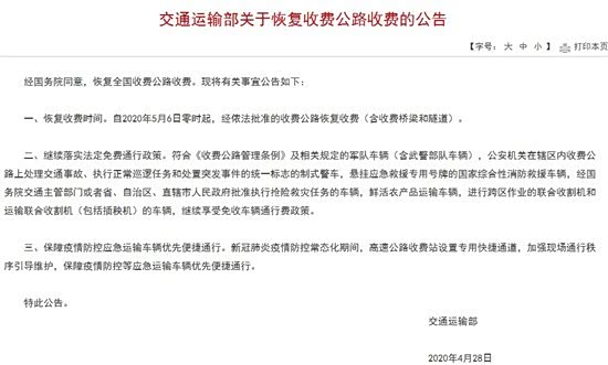 昨日,交通运输部发布公告,宣布自2020年5月6日零时起,经依法批准的收费公路恢复收费(含收费桥梁和隧道)。其中,开放式收费高速公路和普通公路以车辆通过收费站收费车道的时间为准,封闭高速公路以车辆通过出口车道的时间为准。