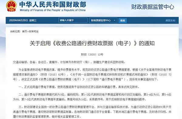 财政部于官网发布《关于启用<收费公路通行费财政票据(电子)>的通知》(以下简称“通知”)称,正式启用通行费电子票据。使用范围适用于征收政府还贷公路的车辆通行费。