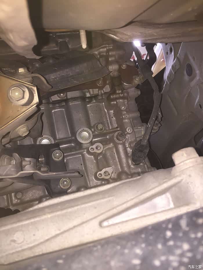 车辆举升起来,顺眼看看发动机的通病位置,一点点油污,还好。这个位置,反正我是不会修的。