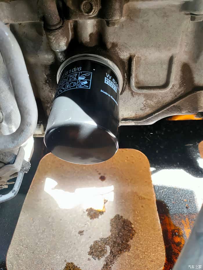 大量的油抽起来很快,几分钟就抽个差不多了,等了10多分钟又抽了一小会,就全是气泡了,确定抽干净了,拆掉旧机滤,换上新的。老范这点很好,打开机盖弯腰就能换滤芯,不用麻烦找坡道、钻车底。