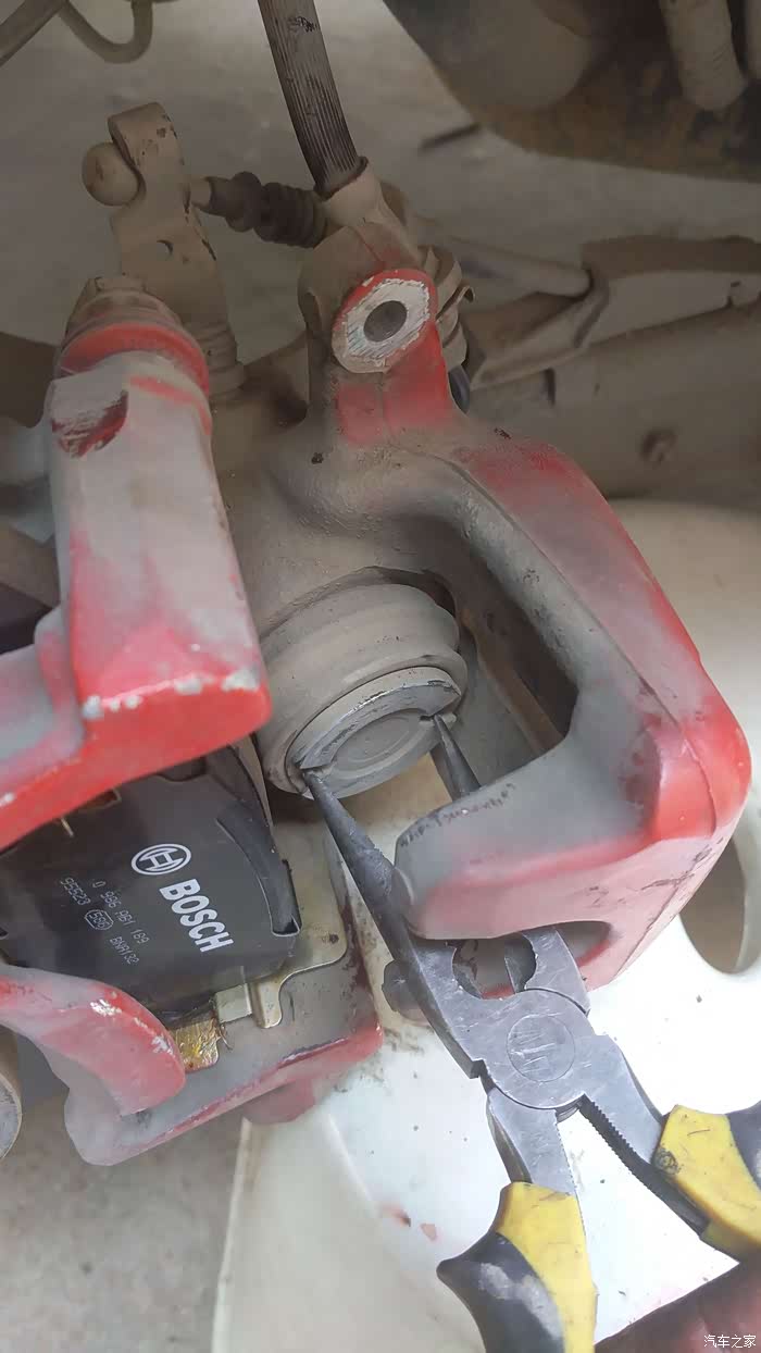 这里就是传说中的用尖嘴钳子复位活塞了,一个人太费事了,卡主开口,顺时针转动,一定要用力,最好找一个人给稳住,这样效率就高太多了,我就一个人,只能找卡点,然后一点一点转,时间都耽搁再这里了,有条件的去买专用工具,或者去借也行,