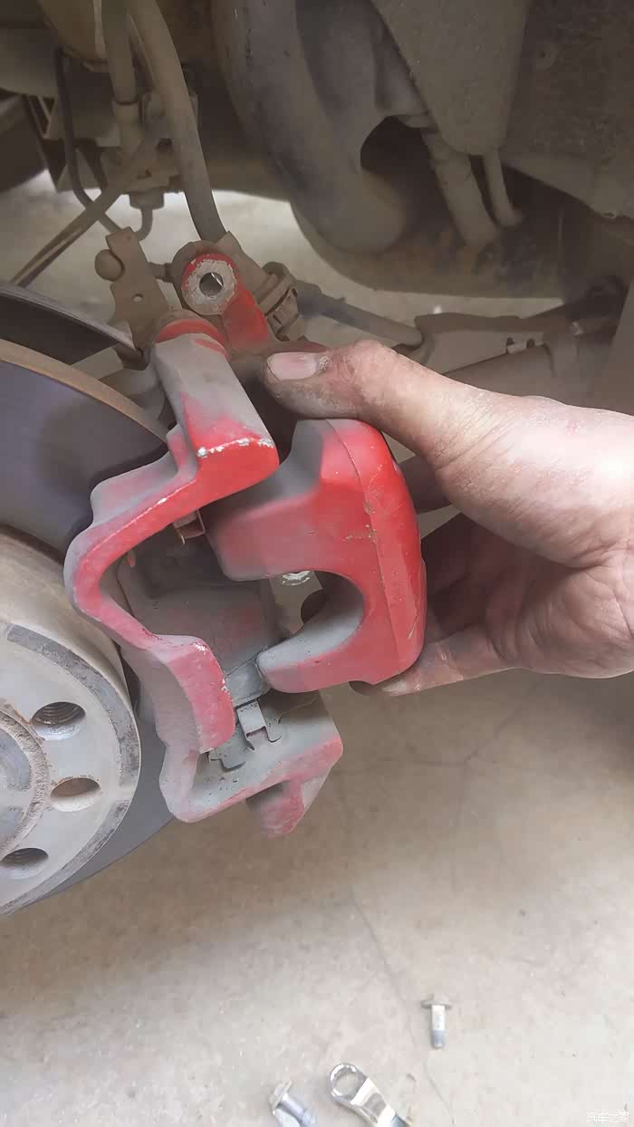 这个铁片可以直接拿下来,不费劲,要清理干净,因为刹车片要滑动的,虽然很小的运动,