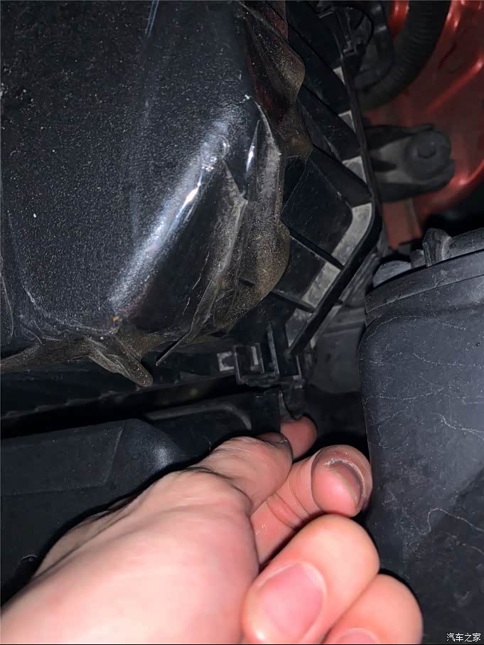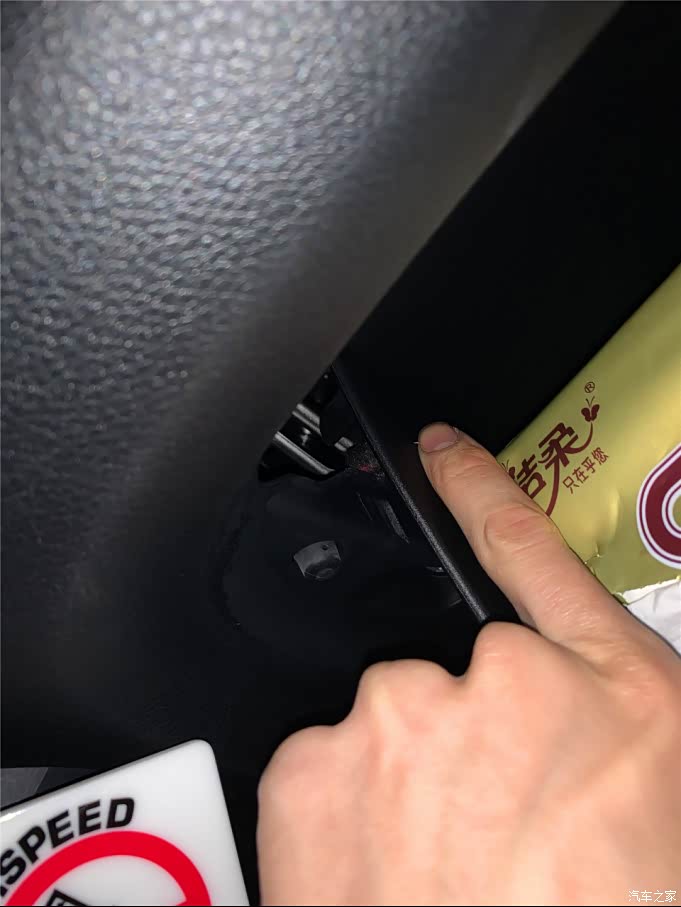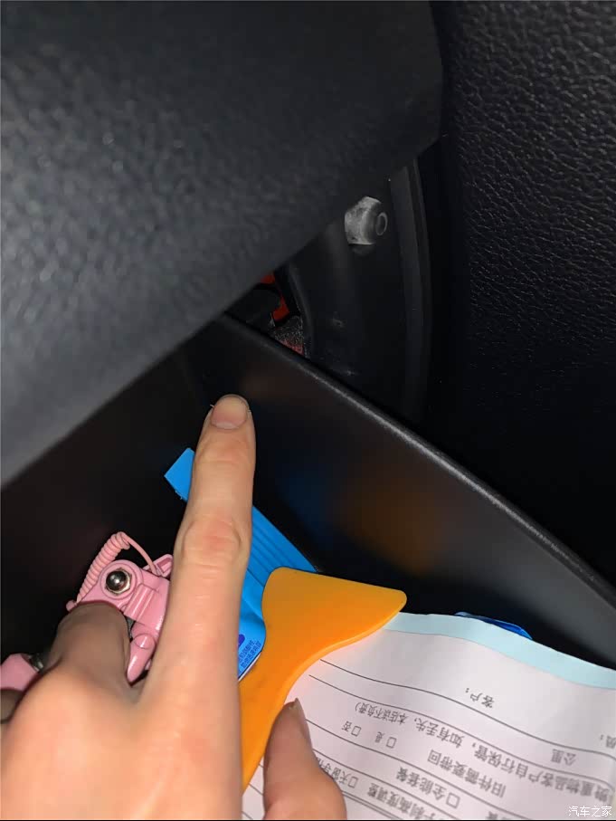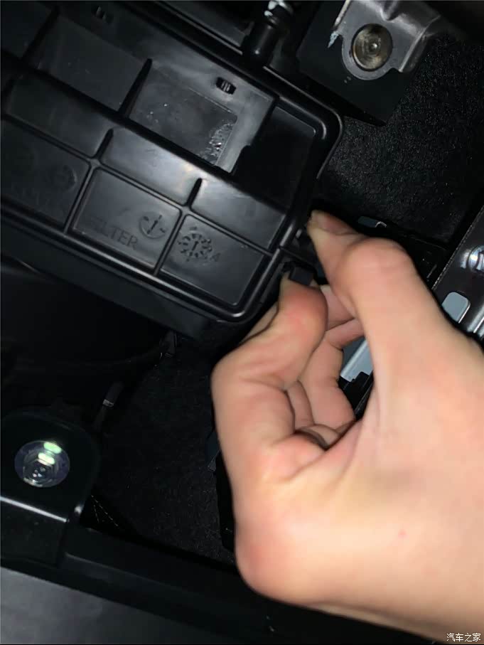 右边也是同样的方法,按压方式往里面压一下就可以出来了!注意储物箱有东西的尽量先拿出来 以防拆下来把东西弄到地毯上!