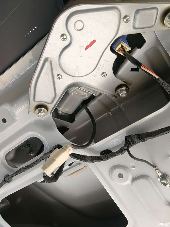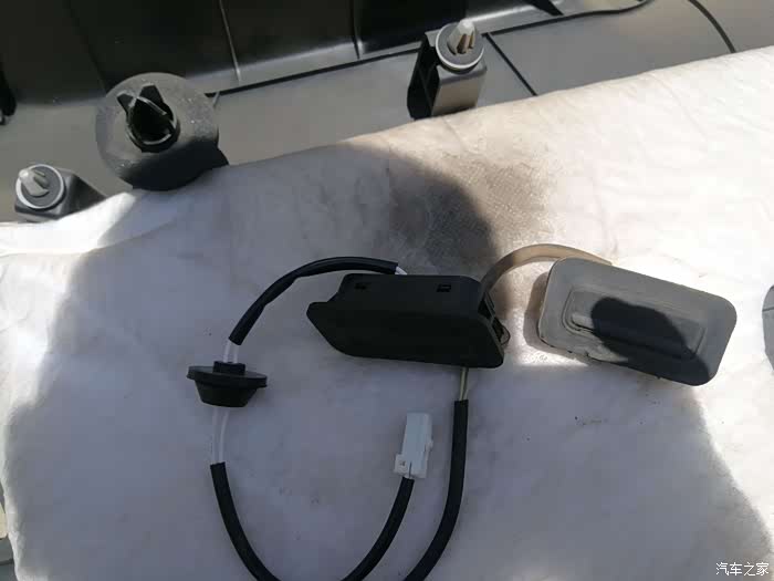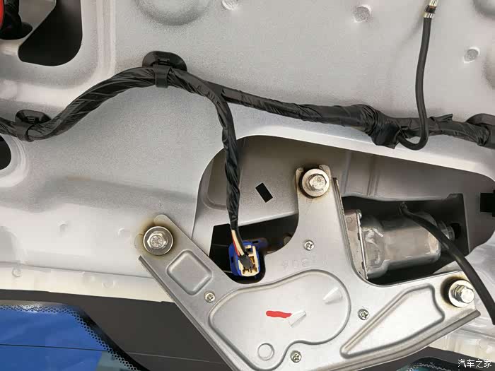 有后雨刮电机遮挡住,新开关从外面安装,先穿入线头。困难的地方是开关电线中间固定的胶块。不容易恢复到原来的位置。开关是卡扣安装,扣好就可以